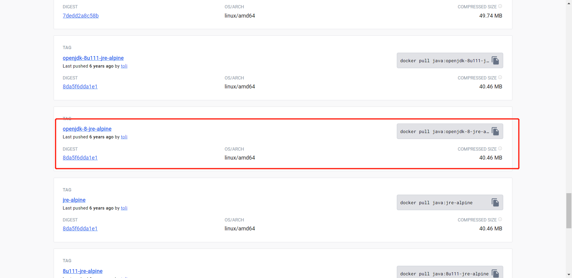 具体的镜像仓库可以在 https://hub-stage.docker.com/ 上面进行查找。比如我选择的这个openjdk8的镜像只有40M,实际pull下来后有100M。